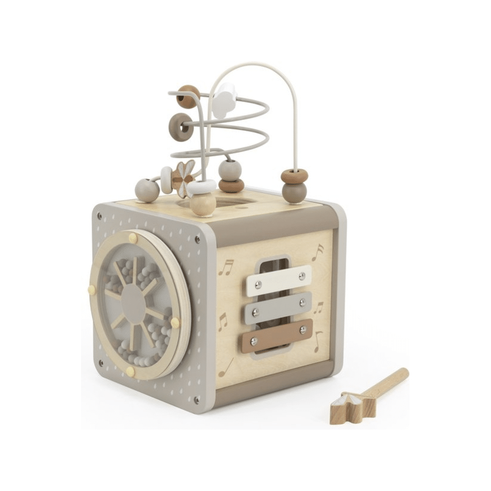 Laat je kleintje ontdekken, voelen en spelen met deze superschattige Activity Cube in zachte nougattinten! Elk vlakje zit boordevol verrassingen: van knisperende stofjes tot een spiegeltje en vrolijke labeltjes om aan te friemelen. Perfect om de zintuigen te prikkelen én de fijne motoriek spelenderwijs te stimuleren. Het zachte materiaal maakt deze kubus ideaal voor nieuwsgierige handjes en veilige verkenningstochtjes. Zet je baby op ontdekking met een wereld vol texturen, geluidjes en beweging – deze speelkubus wordt gegarandeerd een favoriet!